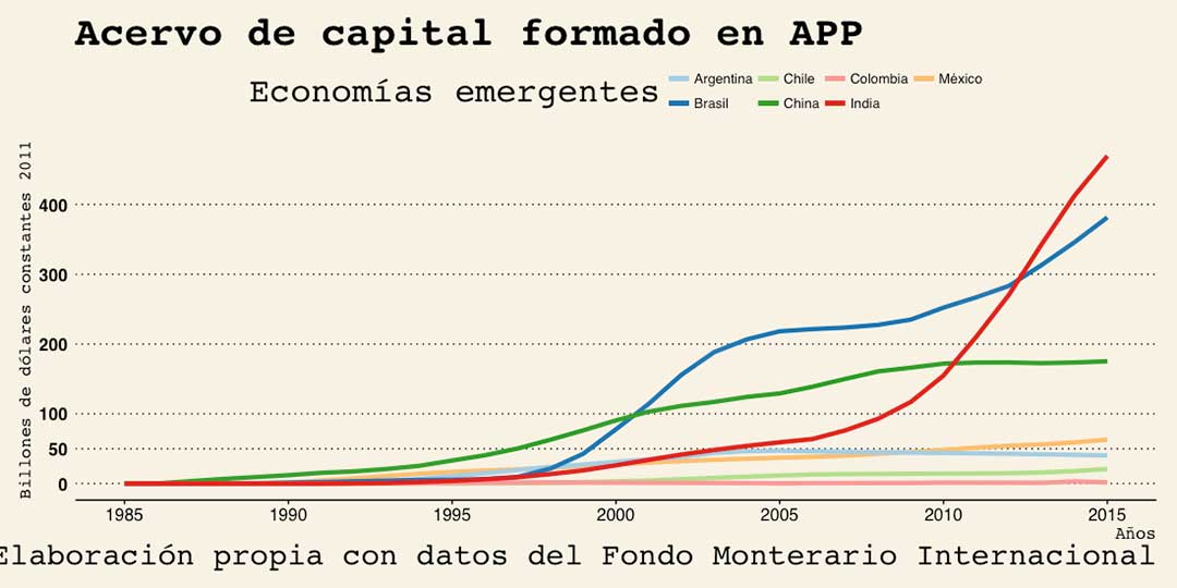 El acervo de capital que se acumula en diversas economías emergentes varía mucho en el esquema de APP. Países como la India y Brasil han formado más de 400 y 300 billones de dólares de capital en este esquema, China, por su parte, aunque se encuentra entre los países que mejor han aprovechado este esquema con casi 200 billones de dólares es apenas una fracción marginal de su inversión pública y privada. México mantiene una tendencia parecida a la de su formación de capital tradicional, una línea con muy poco crecimiento, algo más bien parecido a un estancamiento. Pareciera que esquemas como las APP también funcionan mejor en países donde la inversión privada y especialmente la pública tienen un rol más importante, como guía y semilla para otras inversiones y donde el crecimiento económico abre constantemente nuevas oportunidades.