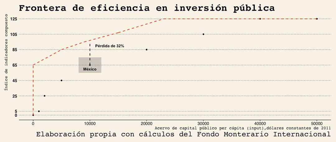 No siendo suficiente con crecer poco porque invertimos poco, el problema para México es peor. Los resultados de la inversión que hoy se realiza son peores que los que se esperarían para un país con el nivel de ingreso per cápita (nivel de desarrollo) que tiene México y para el nivel de gasto que se ejerce. Si hacemos uso de un análisis de frontera para revisar la eficiencia técnica de la inversión pública en México se puede concluir que el país pierde hasta un 32 por ciento3 de los beneficios que debería tener con ese nivel de inversión.