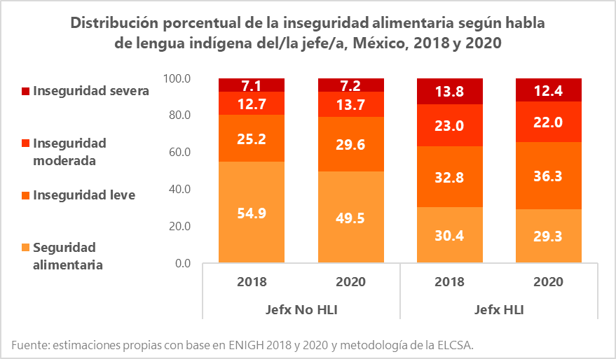 Sin embargo, ante la evidencia sobre los efectos desiguales de la pandemia, se vuelve necesario revisar la distribución de la inseguridad alimentaria entre grupos específicos de población. Observamos, en primer lugar, que la población rural no muestra variaciones sustantivas en sus niveles de inseguridad alimentaria, mientras que la urbana experimentó situaciones que elevaron el nivel leve de la inseguridad alimentaria, con una reducción consecuente en la prevalencia general de seguridad alimentaria (gráfica 1). Sucede lo mismo en hogares donde el o la jefa son hablantes de lengua indígena; parecería que lograron mantenerse estables mientras sus contrapartes no hablantes presentan niveles ligeramente mayores en los grados menos agudos de la inseguridad alimentaria (gráfica 2).