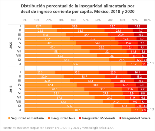 Por otra parte, la seguridad alimentaria está estrecha y sistemáticamente vinculada a la capacidad económica de los hogares: entre mayores son los ingresos, mayor será la probabilidad de encontrarse en seguridad alimentaria, al menos en la manera en que es medida. Si bien esto facilita creer que la distribución de transferencias económicas bastaría para prevenir problemas de acceso alimentario, la persistencia de inseguridad alimentaria en deciles de ingreso medios o altos sugiere lo contrario. De ahí que los cambios más notables entre un año y otro sean la disminución de la seguridad alimentaria y el aumento de la inseguridad leve, una relación que se repite en toda la distribución con diferencias apenas un poco más elevadas en deciles medios.