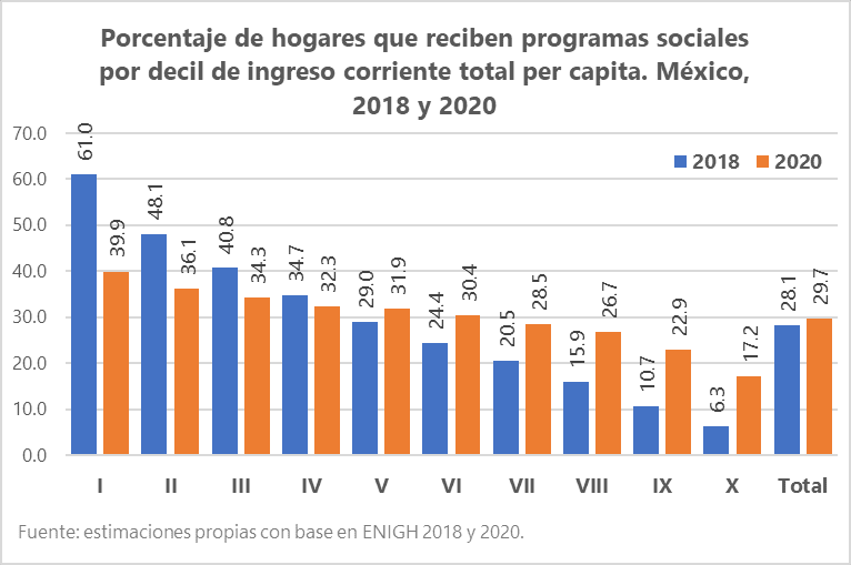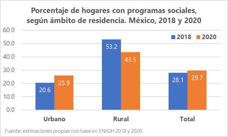 6 Hay que recordar que entre 2018 y 2020 la política social del país experimentó modificaciones importantes. El Programa Progresa/Oportunidades/Prospera, el más antiguo y de mayor alcance, desapareció y fue sustituido por un conjunto de acciones dirigidas a grupos muy específicos de población. En este reacomodo, hogares que usualmente no cumplían con los requisitos para recibir transferencias públicas comenzaron a hacerlo, pero otros que sí recibían apoyos pudieron quedar fuera de los nuevos criterios o empezaron a recibir montos menores.