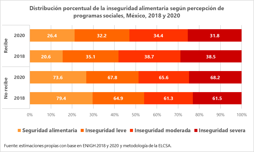 Como muestra la gráfica 7, los hogares perceptores de programas –cuyas prevalencias de inseguridad alimentaria son más altas como resultado de la precariedad que, en principio, les hace candidatos a recibir transferencias–, parecerían haber evitado situaciones que debilitaran aún más su acceso a alimentos, a diferencia de los que no reciben programas sociales y que, según se aprecia, habrían podido hacer buen uso de los apoyos, pues incluso reportan incrementos en la inseguridad alimentaria moderada y severa.