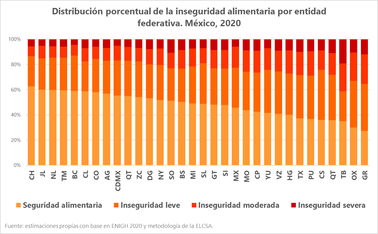 La Encuesta Nacional de Ingresos y Gastos de los Hogares (ENIGH) realizada por el Inegi también permite dar seguimiento al acceso de la población a alimentos y su edición 2020 fue presentada hace unos días. Me sirvo de ella para presentar aquí una brevísima nota sobre el estado de la seguridad alimentaria de la población mexicana, en un año crítico para la salud y la economía de la población. Antes, cabe hacer algunas notas conceptuales y metodológicas. La aproximación de estas encuestas a la seguridad alimentaria se realiza a través de escalas que recogen las experiencias de los hogares en cuanto a las restricciones que han experimentado –o no– en términos de su acceso a alimentos, explícitamente por falta de dinero u otros recursos, durante los tres meses previos al levantamiento de la encuesta.3 Las escalas más utilizadas en el país son la Escala Latinoamericana de Seguridad Alimentaria (ELCSA) y la Escala Mexicana de Seguridad Alimentaria (EMSA), una versión acotada de la anterior. La lógica de las escalas es trazar un continuo de severidad que plantea situaciones que van desde la preocupación por quedarse sin alimentos hasta episodios de hambre en el hogar, distinguiendo cuatro niveles: seguridad alimentaria e inseguridad leve, moderada o severa. La EMSA es utilizada, además, como referencia para la medición del indicador de carencia por acceso a la alimentación del Coneval que, a su vez, forma parte de la estimación global de la medición multidimensional de la pobreza. Retomo la ELCSA incluida en la ENIGH para revisar brevemente el nivel y distribución de la seguridad alimentaria a nivel hogar en 2020 y las diferencias respecto a los resultados de su medición en 2018.