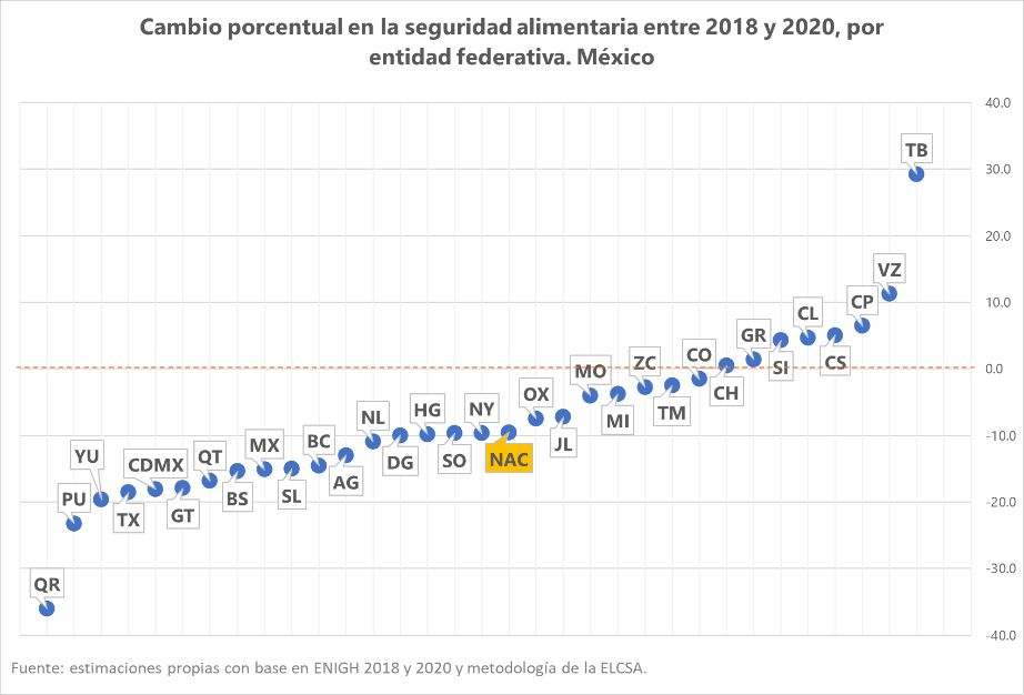 Finalmente, revisamos el escenario del acceso a los alimentos en las entidades. En la gráfica 8 los estados aparecen ordenados de mayor a menor nivel de seguridad alimentaria en 2020, mientras que la gráfica 9 muestra el cambio porcentual experimentado en este indicador respecto a 2018. Las entidades que concentran mayores niveles de población en pobreza suelen encontrarse al final de la distribución. Si bien en 2020 éste sigue siendo el caso, llama la atención encontrar a entidades con mayores niveles de riqueza entre las que más descendieron durante el periodo observado, como Nuevo León, la Ciudad de México o Aguascalientes (gráfica 9). Es imposible no notar el desplome dramático de la seguridad alimentaria en Quintana Roo, una entidad históricamente desigual, pero con niveles de pobreza por debajo del promedio que podrían verse severamente afectados por el impacto de la pandemia en el turismo.7 En el extremo contrario destaca el aumento de la seguridad alimentaria en Tabasco, una entidad que en todas las mediciones de pobreza sobresale por sus altos niveles de carencia alimentaria.