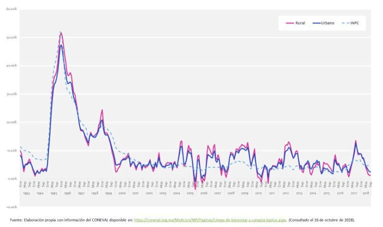 El escaso crecimiento económico, la baja generación de empleo de calidad y alta productividad, así como la ausencia de un replanteamiento de las políticas salariales que mejoren la capacidad adquisitiva real de la población, han impedido que la pobreza monetaria se reduzca más allá de lo que las políticas sociales asistenciales —basadas preponderantemente en transferencias condicionadas de dinero— han podido contener en términos de pobreza alimentaria, generalmente definida como la insuficiencia de recursos para cubrir el costo de una canasta alimentaria básica, cuyo valor mensual actual por persona asciende a poco más de mil pesos en el medio rural y a 1,500 en las ciudades.1