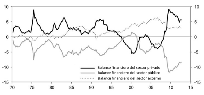 Gráfica 1: Balances financieros sectoriales de Estados Unidos (% de PIB; 1970-2013)