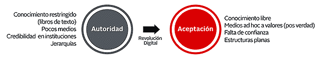 Considerando lo anterior se presenta el siguiente cambio de paradigma en la comunicación: el modelo autoridad-aceptación. En síntesis, proponemos que gracias a la digitalización (para fines persuasivos) es menos importante la autoridad de la fuente de nuestro mensaje que la aceptabilidad del mensaje mismo en relación con las creencias preestablecidas de nuestro público.